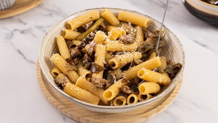 This pasta with artichokes and sausage will quickly become a favorite for many reasons: