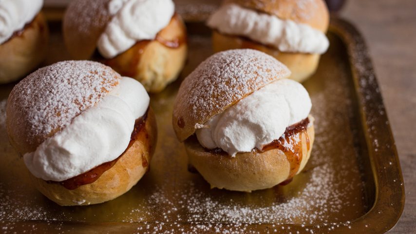 Once the buns have cooled, cut them two-thirds of the way through and fill them with the jam and cream.