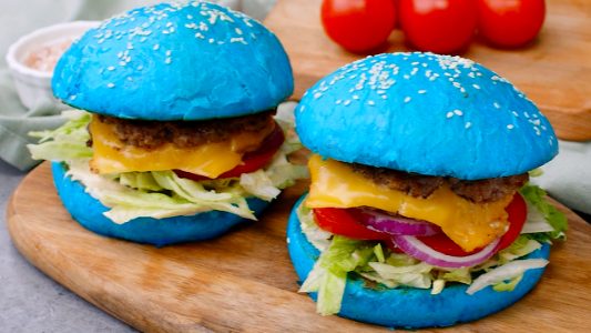 If you are wanting a way to spruce up traditional hamburgers, then you can try these blue burger buns which have a brilliant blue color and fluffy texture. These buns are yeast-based, which results in an optimal texture and flavor. Sandwiched with homemade beef burger patties, tomato, lettuce, onion, and all of the typical burger fix-ins, you will love this unique take on homemade burgers.