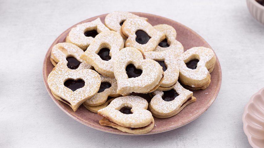 These are classic jam sandwich cookies made from a shortbread-style dough, cut into heart shapes and paired together with strawberry jam. One cookie remains solid, while the other features a smaller heart cut-out in the center, allowing the jam to peek through. They’re often called Linzer-style cookies, even though this recipe keeps things easy and streamlined. The final look is fancy, but the method is beginner-friendly and honestly kind of therapeutic.