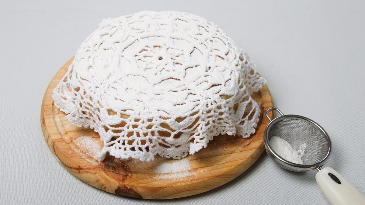 Sprinkle the vasilopita with powdered sugar by using a stencil or a woven cloth