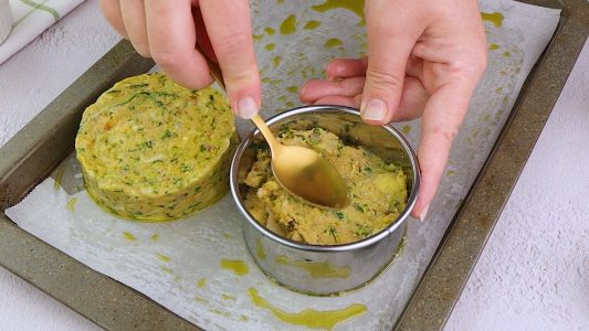 Drizzle a parchment-lined baking sheet with olive oil. To make four burgers, using a burger press, fill it up halfway with the zucchini mixture and arrange cheese on top.