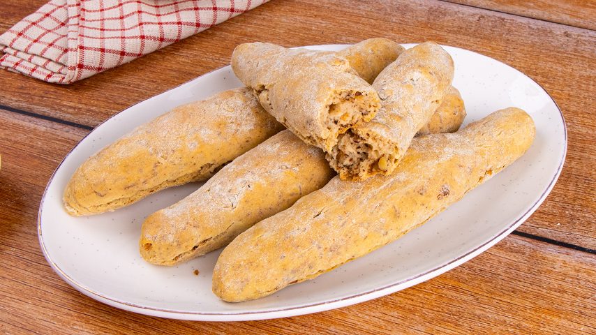 These mini walnut loaves are dense, satisfying quick breads enriched with extra virgin olive oil and semolina for added texture. Unlike traditional yeast bread, they use baking powder as a leavening agent, so there’s no need to wait for the dough to rise. With chopped walnuts kneaded right into the dough, every bite bursts with flavor and crunch—making these loaves a savory highlight on any table.