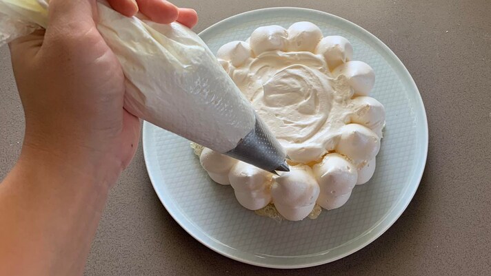 Form at least two rows of tufts and leave a slightly lower level in the center to be able to decorate the Pavlova more easily once baked.